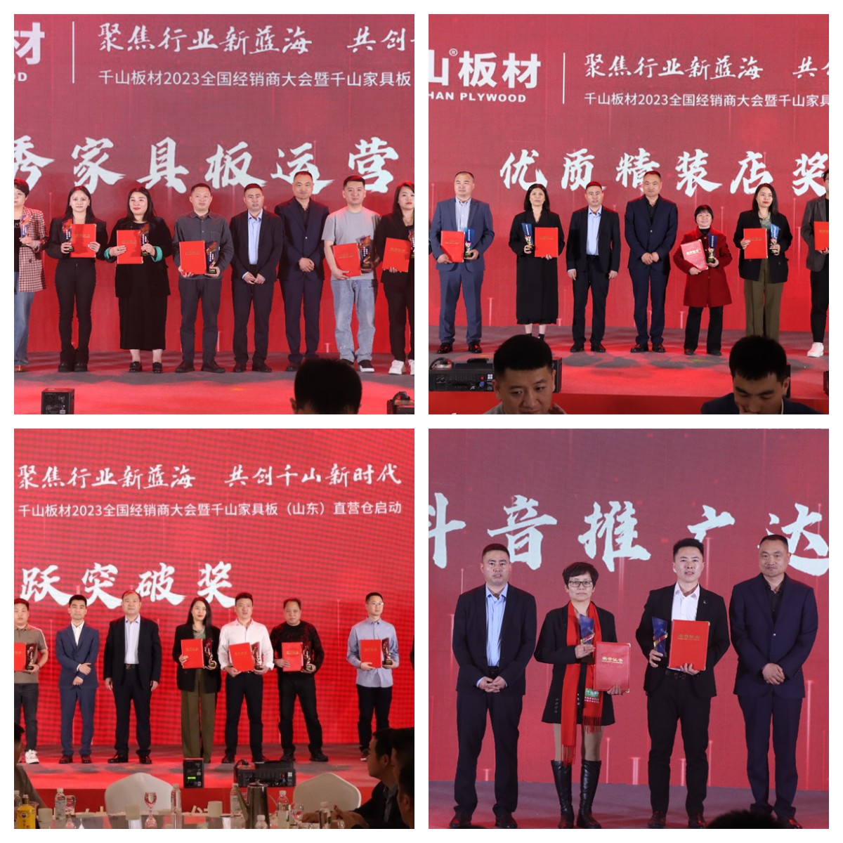 會議現場還頒發了“飛躍突破獎”、“家具板運營獎”、“優質精裝店獎”、“抖音推廣達人”四項大獎,全場歡呼,共享喜悅。