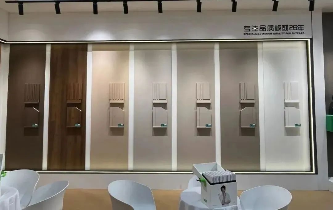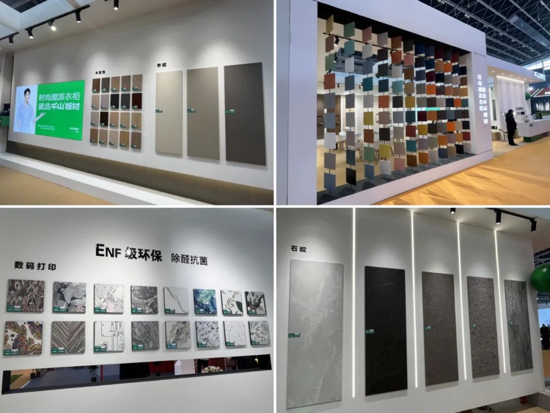 展館內(nèi),千山板材立柱以多樣形式展示了2024全系列潮流花色,涵蓋木紋系列32款、純色系列41款、布紋石紋系列8款、高定系列10款、數(shù)碼打印系列16款。