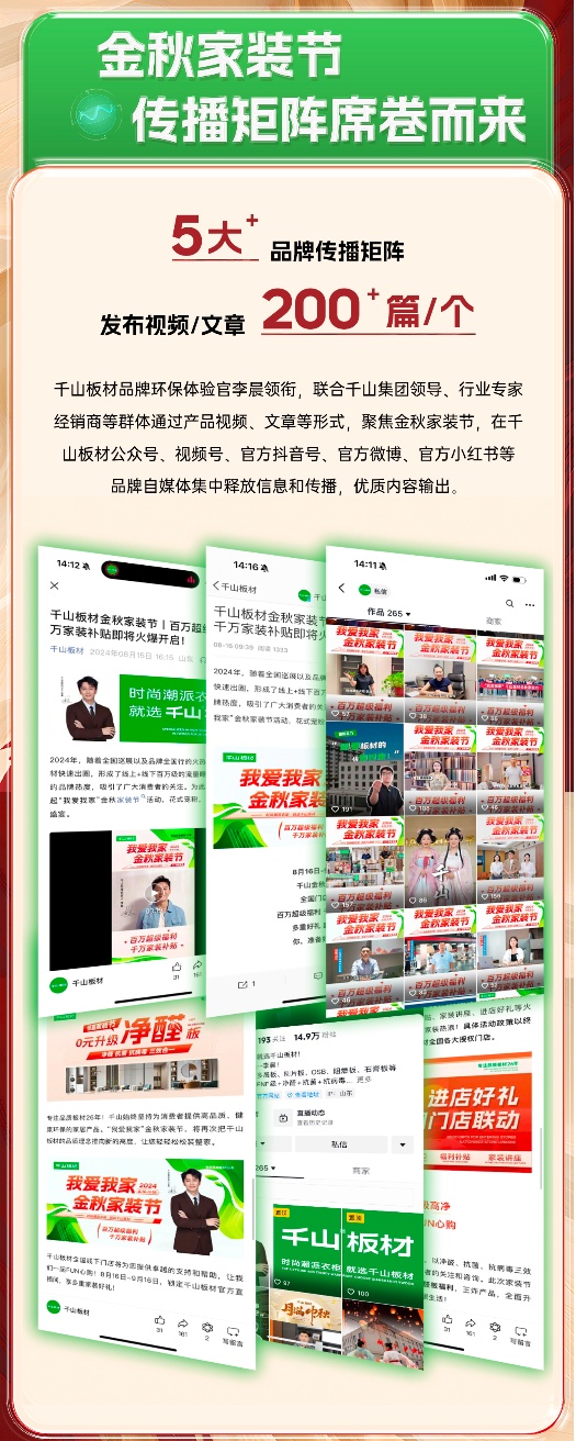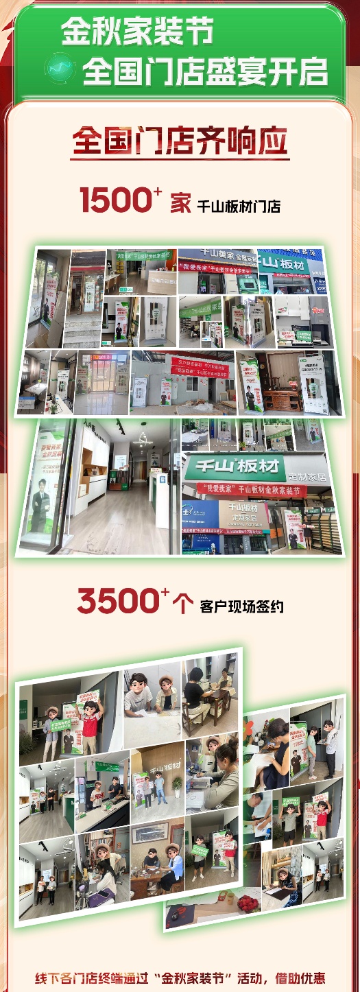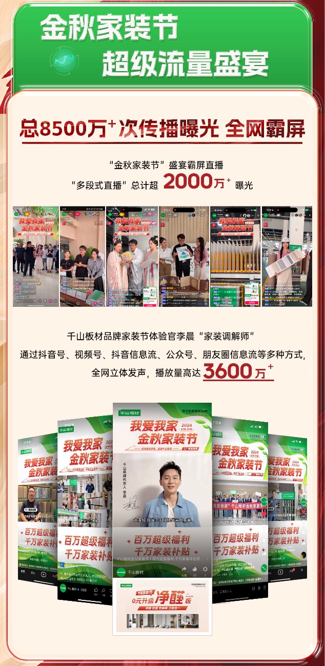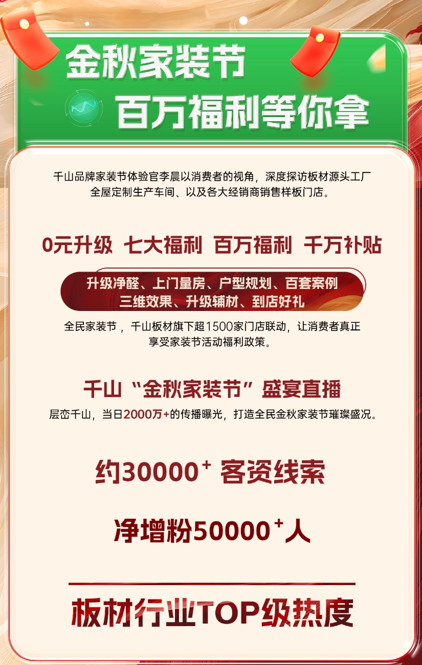 8月16日,千山金秋家裝節(jié)火爆上線,截至9月16日,為期30天的家裝節(jié)活動(dòng)日前正式落下帷幕。活動(dòng)期間,千山板材全國(guó)1500+門(mén)店聯(lián)動(dòng),全網(wǎng)曝光量超8500萬(wàn)、線上直播觀看量超2000萬(wàn)、簽約數(shù)量達(dá)3500+,實(shí)現(xiàn)了品牌聲量和銷售業(yè)績(jī)的雙豐收!