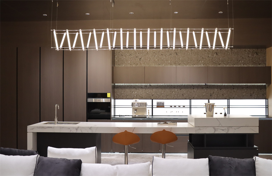 跟隨展廳動(dòng)線,來(lái)到了現(xiàn)代風(fēng)格的開放餐廚展區(qū)。護(hù)墻板主體顏色為侘寂風(fēng)×朝陽(yáng)橙,采用18厘ENF級(jí)刨片板,展示柜采用意大利石紋×芬蘭玉石,營(yíng)造現(xiàn)代富有格調(diào)的空間氛圍。