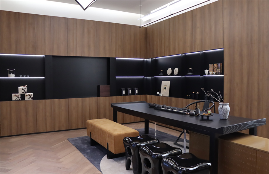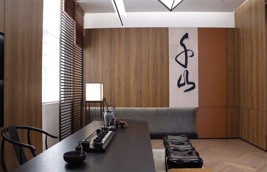 新中式風(fēng)格茶室主體配色為門墻柜一體花色金色胡桃,其獨(dú)特木質(zhì)紋理營(yíng)造出自然質(zhì)樸之韻,與木質(zhì)護(hù)墻板與地板遙相呼應(yīng),兼具耐用性和溫暖質(zhì)感。