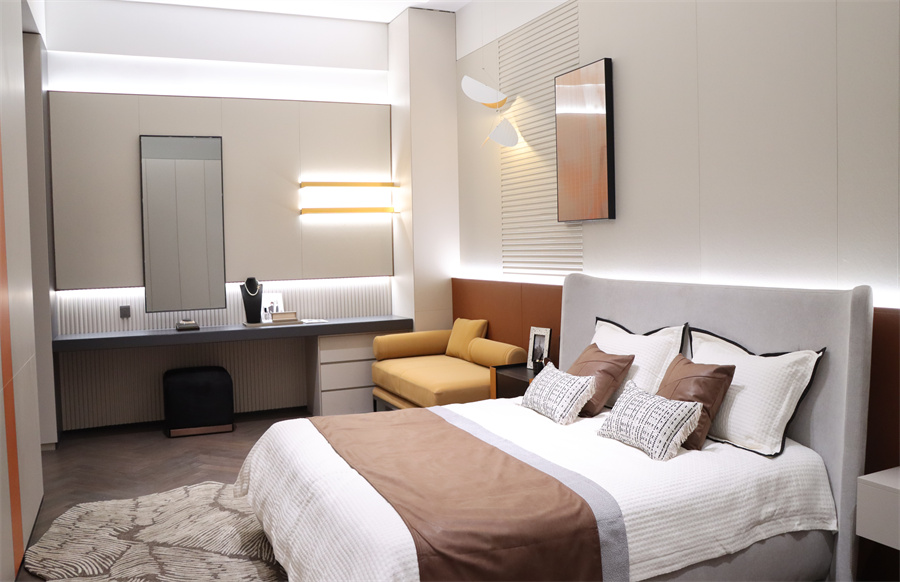 展廳五大空間呈現(xiàn)現(xiàn)代極簡(jiǎn)、現(xiàn)代輕奢、新中式三大主流家裝風(fēng)格,采用千山板材四大品類,糅合六大系列花色:木紋系列、純色系列、石紋系列、同步系列、數(shù)碼系列、PET系列,演繹多元化生活場(chǎng)景。