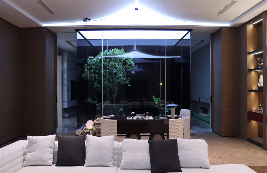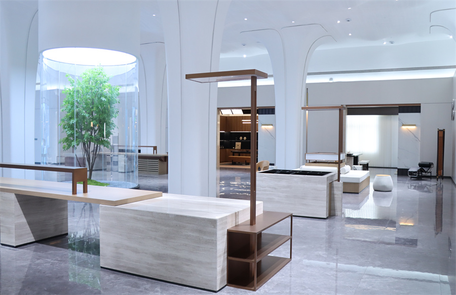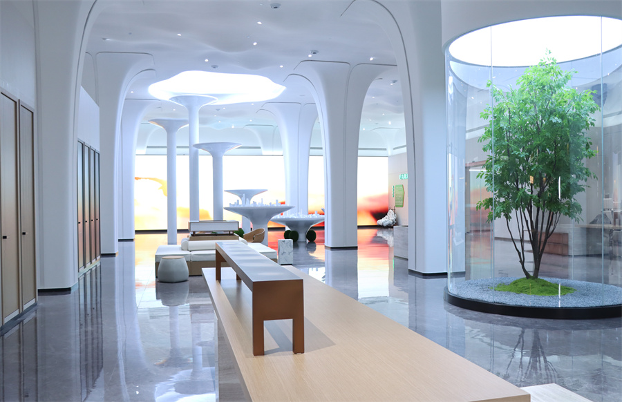 1500㎡現(xiàn)代美學(xué)空間,主中心以“生命之樹”為設(shè)計(jì)理念,營(yíng)造自然與人文交融的場(chǎng)景化空間。吊頂以綿延的山脈形態(tài)表達(dá)千山砥礪深耕的工匠精神,樹冠形態(tài)的立柱寓意生命之樹的自然生長(zhǎng)和璀璨綻放。