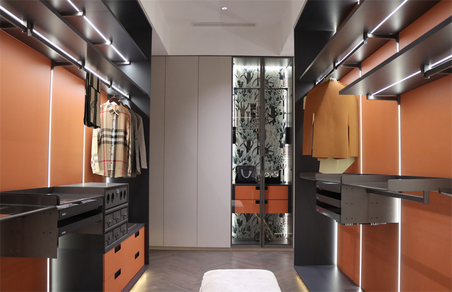 整體色調(diào)以深灰×西柚紅為主,形成鮮明對(duì)比,視覺(jué)效果強(qiáng)烈,秘境森林背板點(diǎn)綴整個(gè)衣帽間。置物柜采用當(dāng)下流行工藝,四邊45°斜切,簡(jiǎn)約風(fēng)格深受年輕人喜愛。