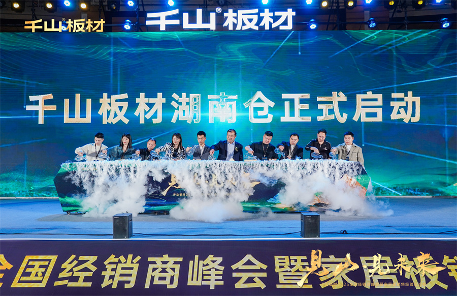 馬彥慶董事長、王松副總經理以及千山板材湖南倉經銷商代表孫丁娟、李濤、李維新、肖曉燕、陳江南、李輝、劉凡華、周亮共同登臺,攜手啟動千山板材全國現貨倉第四大倉——湖南倉。
