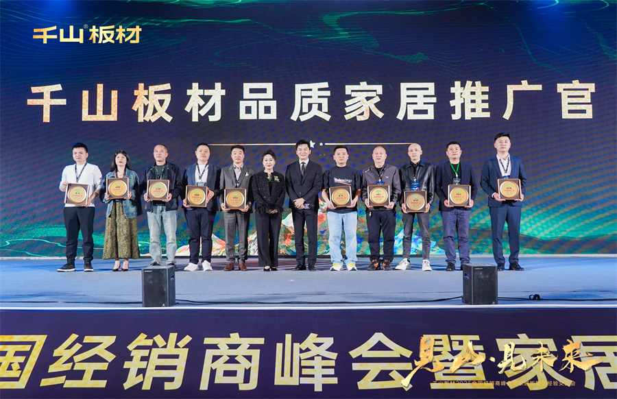劉董為李晨先生授予“品質家居體驗官”,同時為十位在千山板材銷售領域表現卓越的經銷商授予了“品質家居推廣官”榮譽,不僅是對他們過去一年里在提升家居品質、推廣優質板材方面所做出杰出貢獻的肯定,也是對他們未來繼續引領家居潮流、傳遞品質生活的期待與鼓勵。
