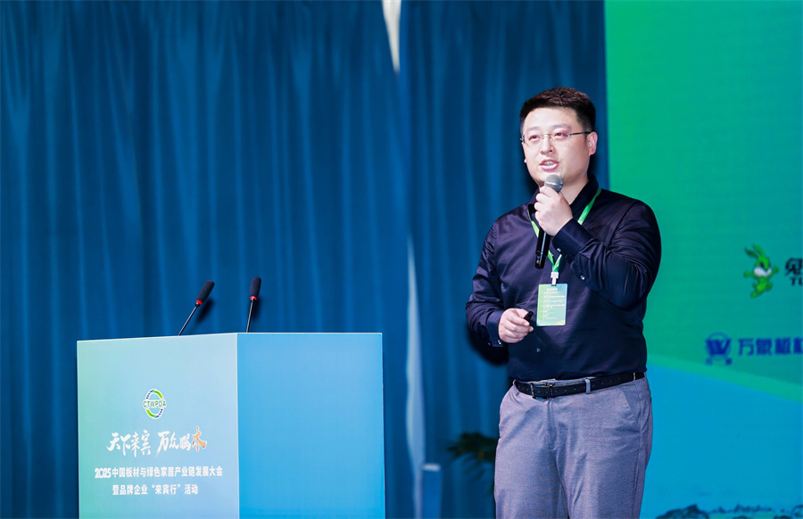 千山板材東南大區負責人董向陽以《板材品牌綠色產業發展之路》為主題,解碼千山的高質量發展之路。千山以“雙碳”戰略為引領,構建覆蓋全產業鏈的綠色發展體系,通過“綠色智造、低碳循環、價值共生”三大維度,實現產業升級與生態效益的雙向突破,打造出具有行業示范價值的可持續發展范式。