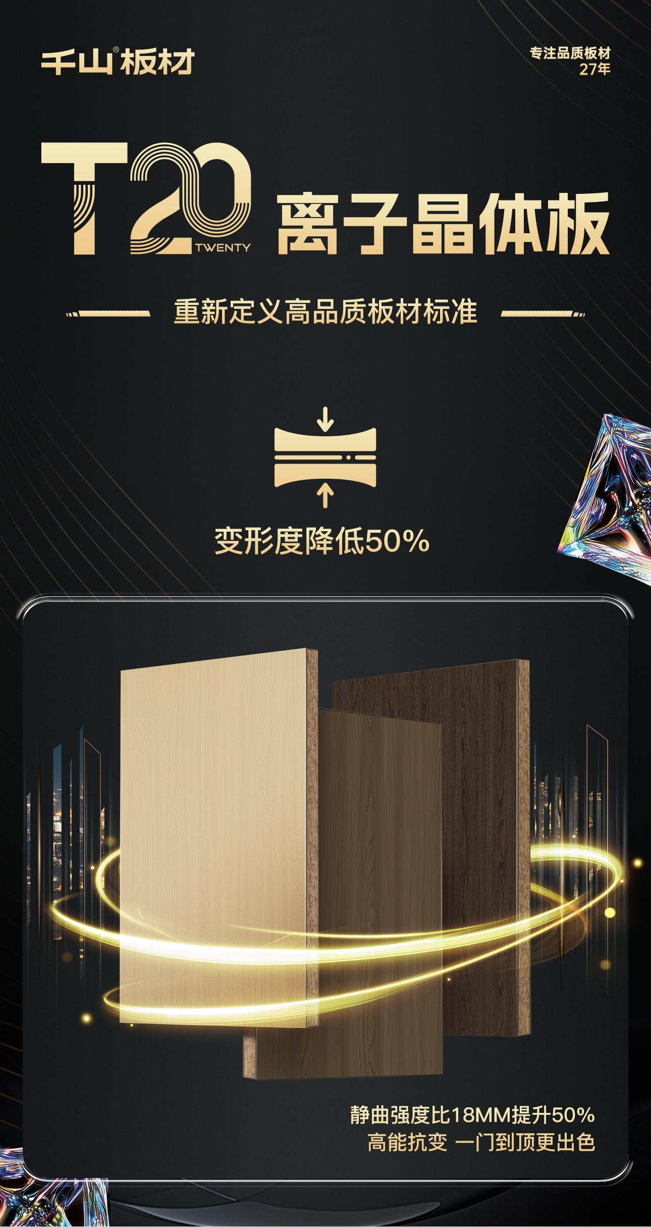 T20離子晶體板:是表面覆有離子晶體層,板材承重比常規18mm提升50%,變形度降低50%,耐磨性能提升3倍以上的20mm高端飾面板材。T20離子晶體板是千山板材推出的高端飾面板材,由千山集團與南京林業大學材料科學與工程學院聯合研發,于2025年4月18日在臨沂全屋定制展首次發布,定價1099元/㎡,旨在為消費