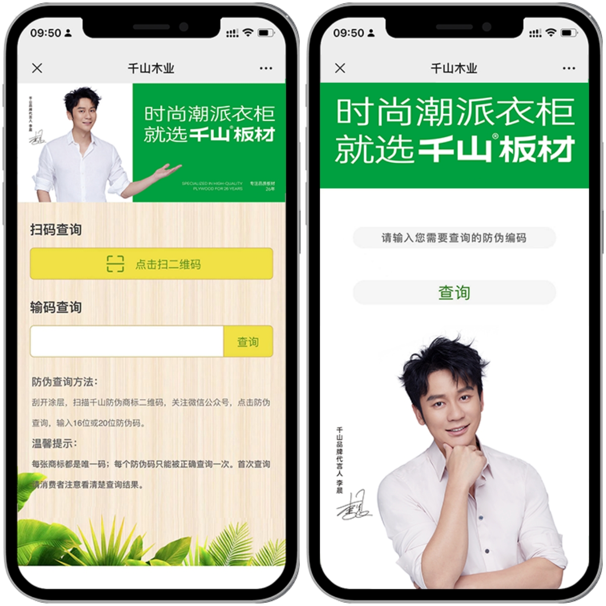 刮開二維碼涂層,關注微信公眾號「千山板材」,點擊底欄「防偽查詢」,選擇「板材」或者「輔料」,掃描二維碼或者輸入商標防偽碼,查詢即可。