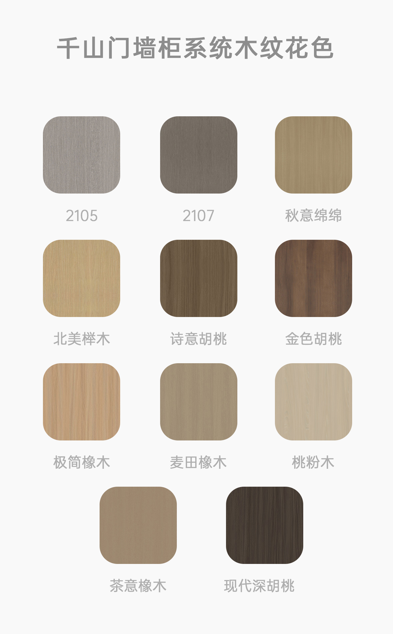 潮流色彩的呈現(xiàn)是門墻柜一體設(shè)計的重點,千山門墻柜系統(tǒng)23款極致色彩實現(xiàn)審美升級,滿足極簡、現(xiàn)代、中式等多樣風(fēng)格的家裝需求。