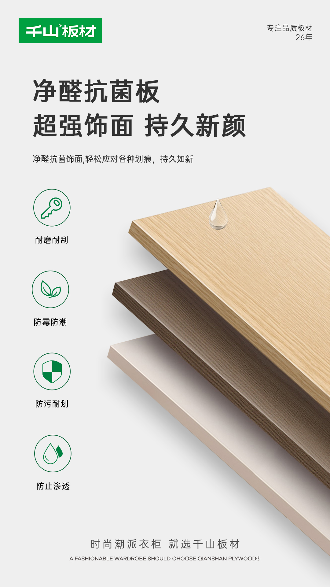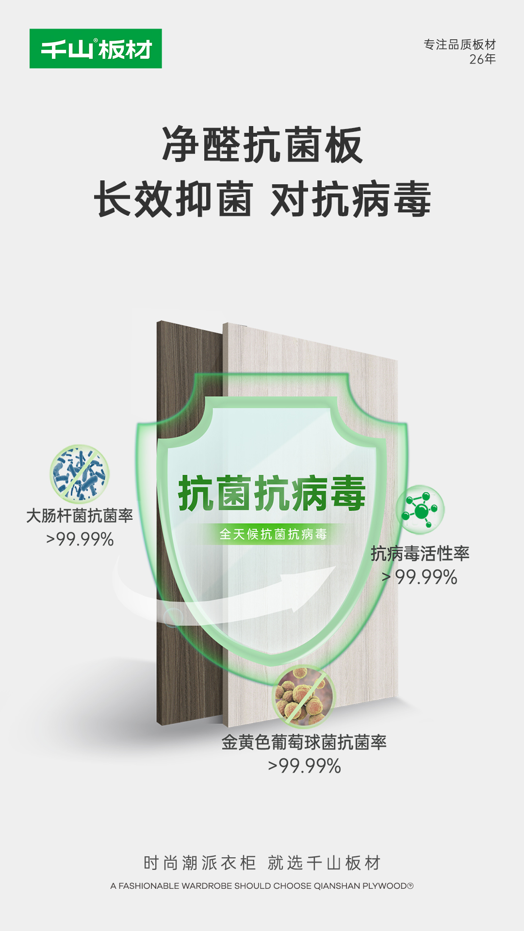 千山板材凈醛板采用ENF級無醛添加基材,涵蓋刨片板、多層板、實木板,以六大硬核優勢強效發力,凈醛、抗菌、抗病毒三效合一,開啟環保新“凈”界,從源頭打造“無醛”之家。