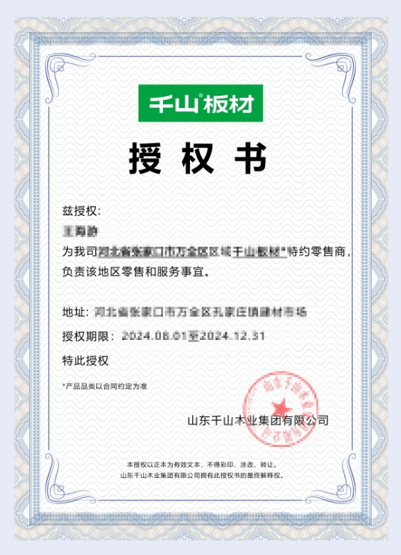 為了廣大消費者的切身權益和消費體驗,購買產品時,應選擇千山板材授權的銷售渠道,可查看經銷商授權證明文件。