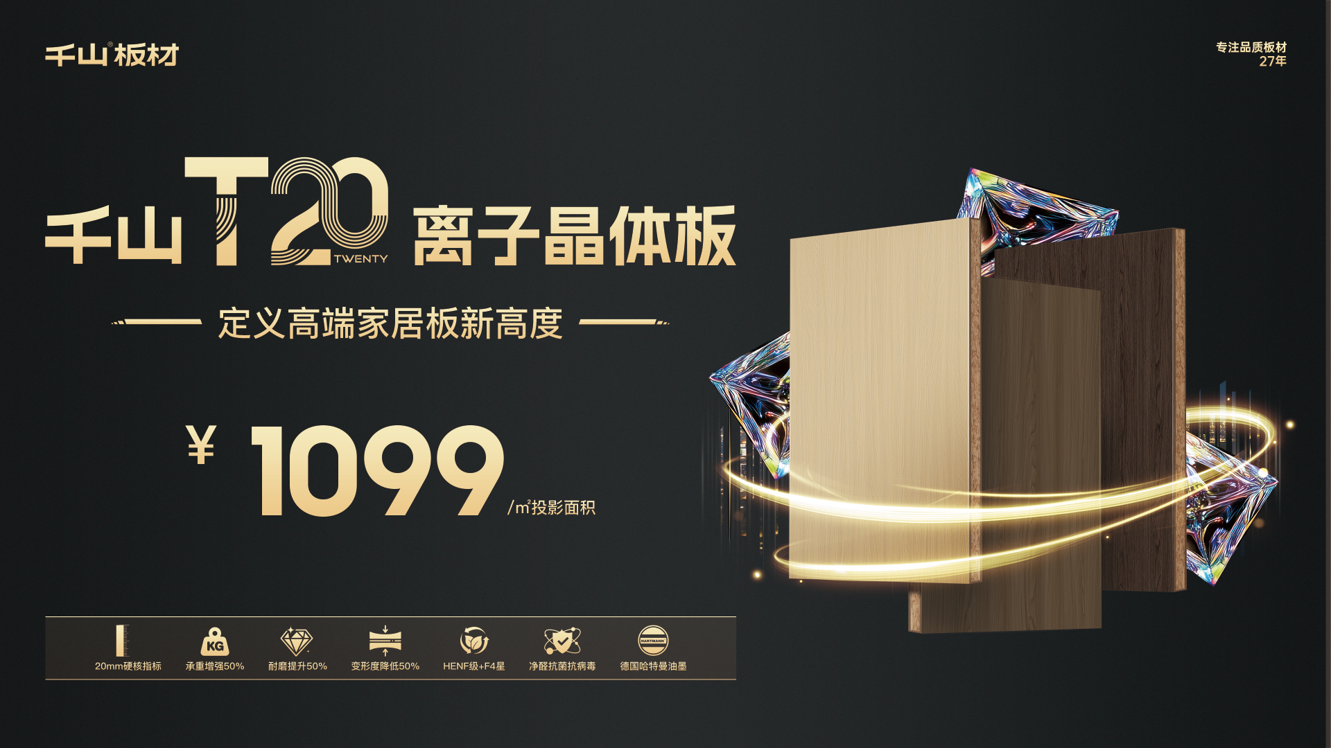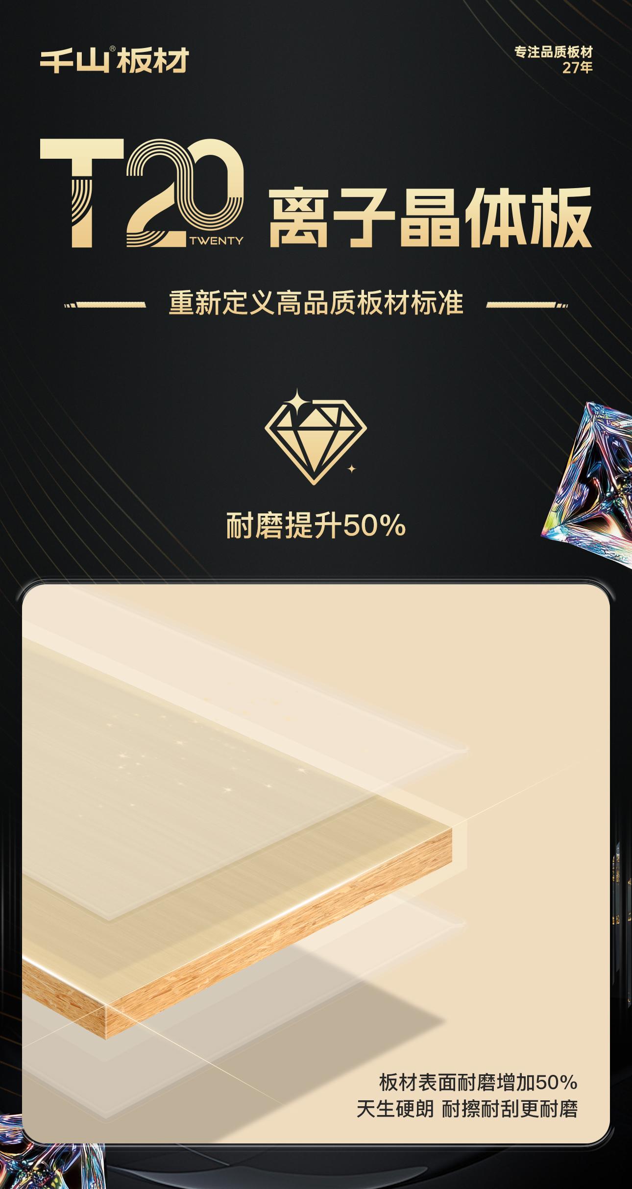 千山板材全新一代高端飾面板材@T20離子晶體板,1099元/㎡高燃上市,憑借剛強(qiáng)性能及多元飾面,有效提升了板材的耐用性和美觀性,再次刷新現(xiàn)代家裝對(duì)高端產(chǎn)品的需求,重新定義高品質(zhì)板材標(biāo)準(zhǔn)!